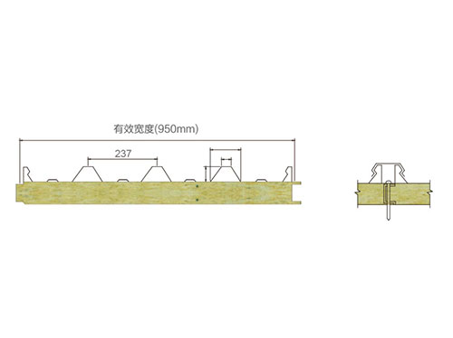 950型扣帽式瓦楞板,防水性能更加,最長可做到18m長,方便吊裝,保溫裝飾一體化。